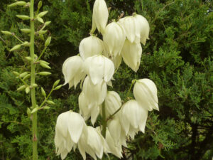 Comments: The white bell-shaped blossoms atop solitary flower spikes attract night-pollinating moths. The foliage is deer resistant, but they like to eat the blossoms.